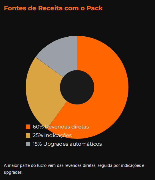Liberdade total: estrutura própria com página premium, área de membros completa, vídeos, tutoriais, direito de revenda, packs premium e seus próprios meios de pagamento (Pix, PagSeguro, WooCommerce…). Lucro integral e controle total.